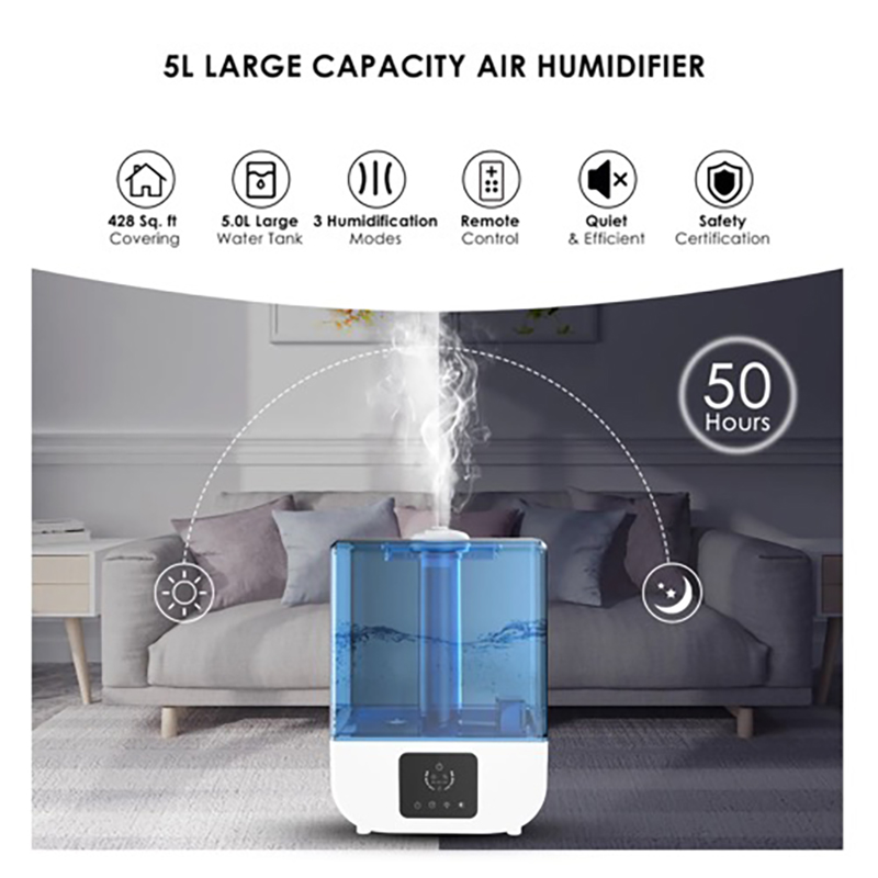 Home Ultrasonic Mist air Humidifier, Top Fill 5L Big Capacity Water Tank Easy to Load Water, Easy Clean, for Large Room, Bedroom, Living Room, Office, Home Plant, Premium Design, Control Method – Touch and Remote, Humidity Control – Auto Mode, Humidifty Level, 5 Spead Levels. for Room 400 sq ft – Runtime 32-40 Hours – Auto Shut Off – Sleep Mode – Night Mode – Timer – 110 Volt AC – Ultra Quiet – Noise Level ≤ 30dB